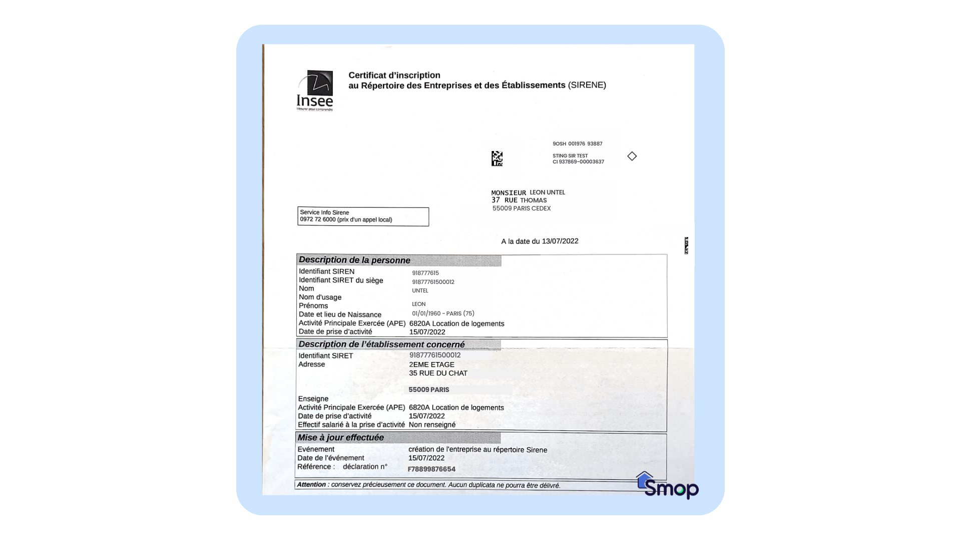 Ce document est délivré par l'INSEE. Il indique les informations relatives à votre activité (SIRET, date d’immatriculation, etc.). Vous devez simplement le conserver.