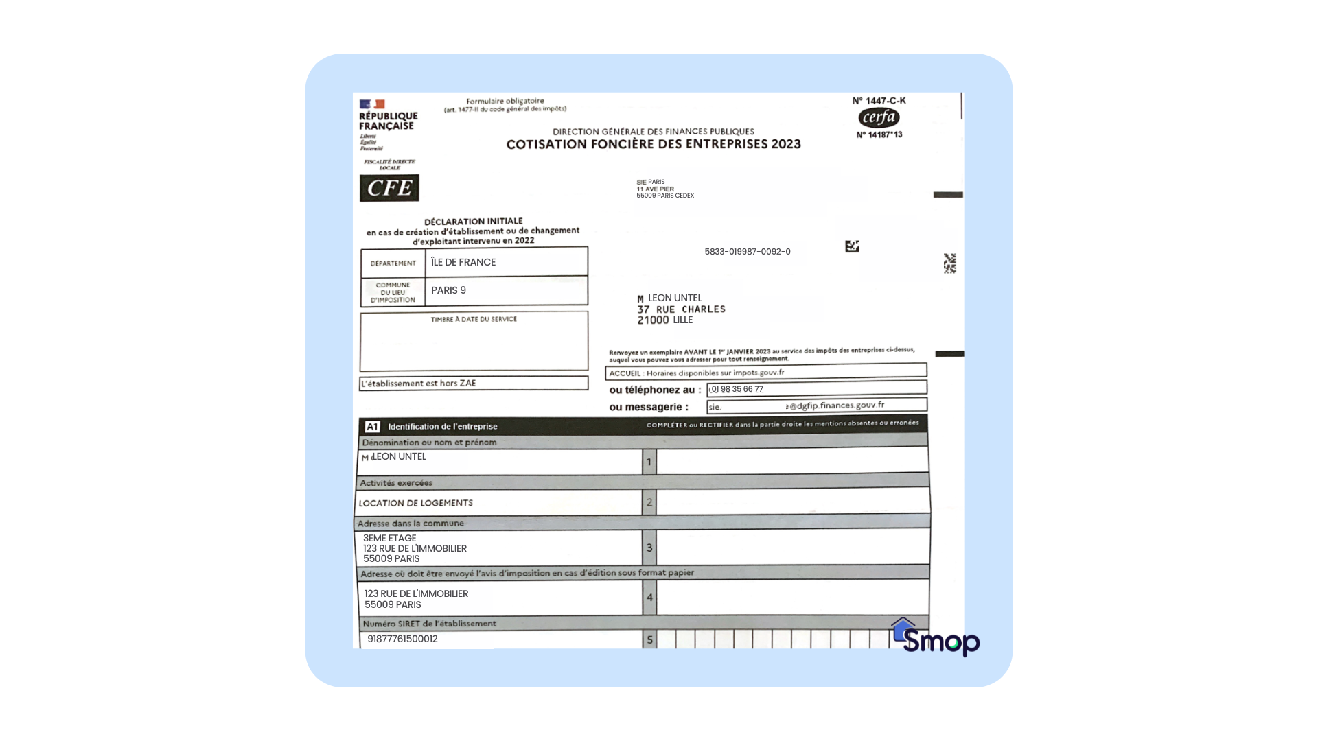 Il s’agit du document relatif à la taxation de la cotisation foncière des entreprises (CFE). Vous devez le compléter et le renvoyer au service des impôts des entreprises.